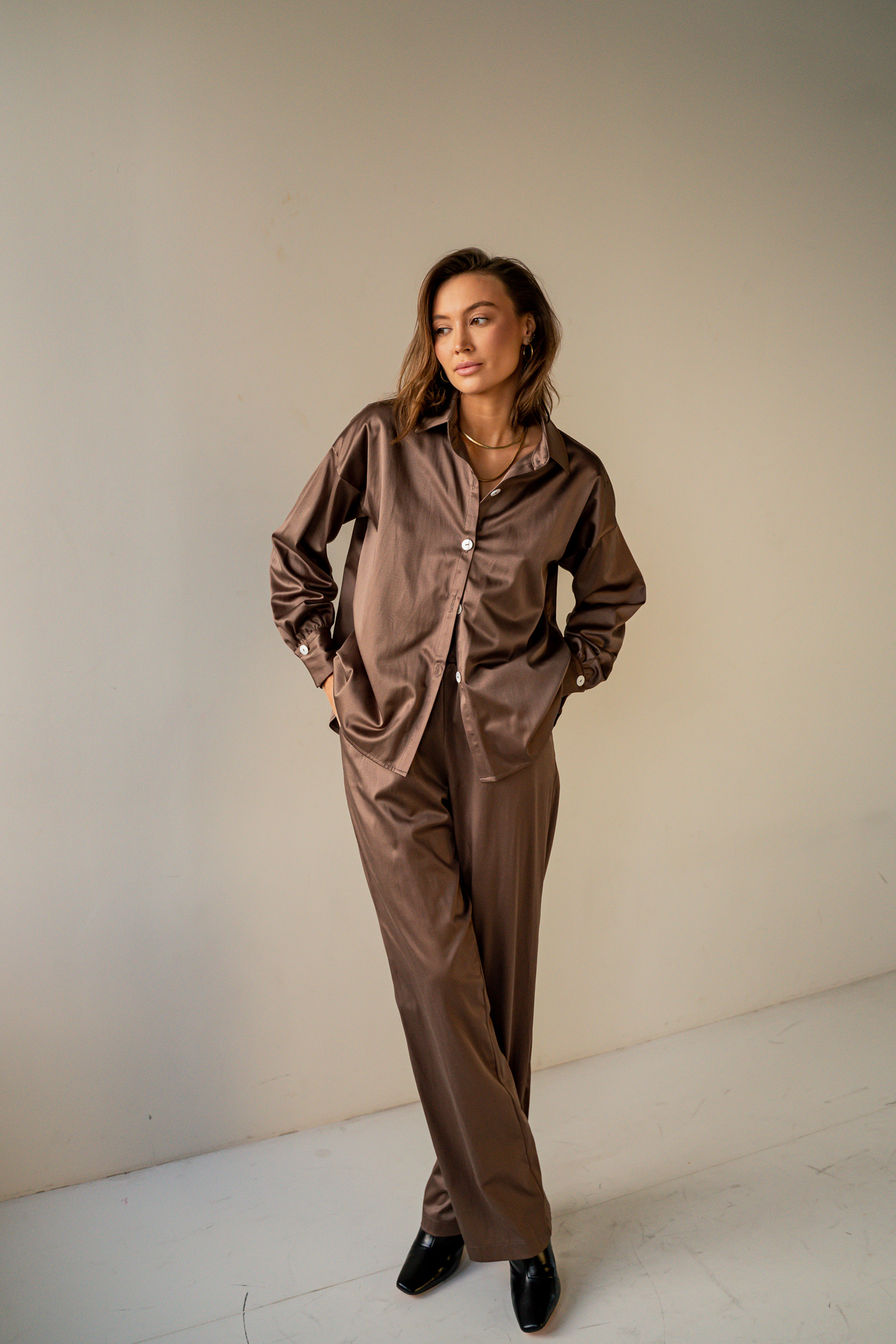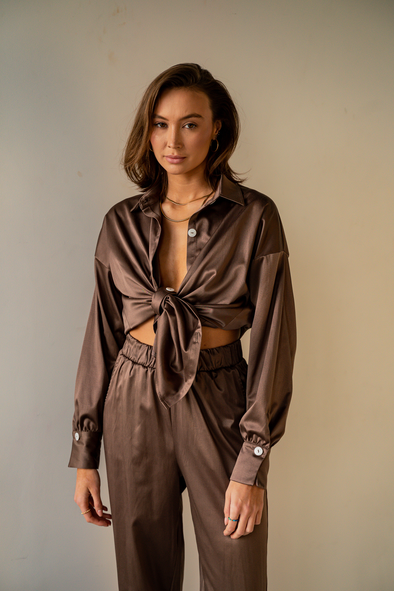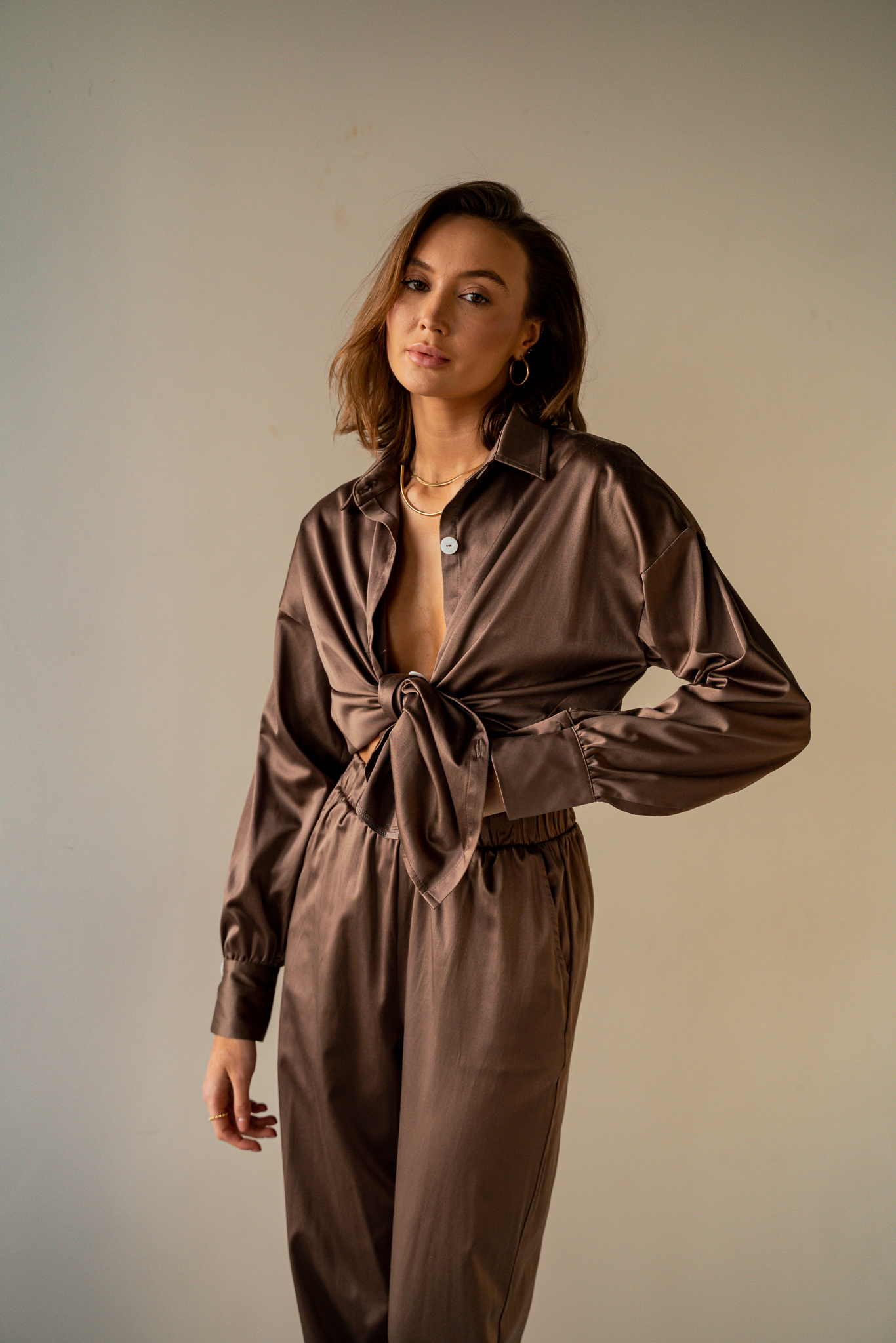 •Komplet Nugat. To komplet, który sprawdzi się idealnie na wieczorną kolację jak i na bieganie po mieście. Obniżona linia ramion, wpływa na wygodę noszenia. Gumka w talli podkreśla Twoją figurę! Zwiąż włosy w kucyk naszą frotką Rainbow i twój look gotowy.