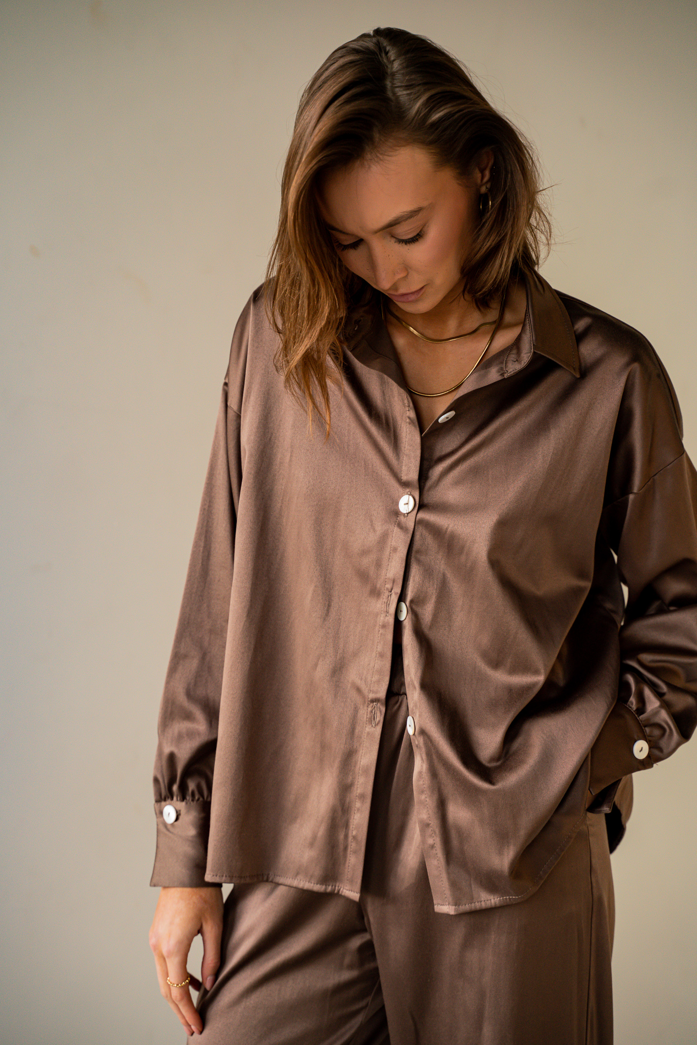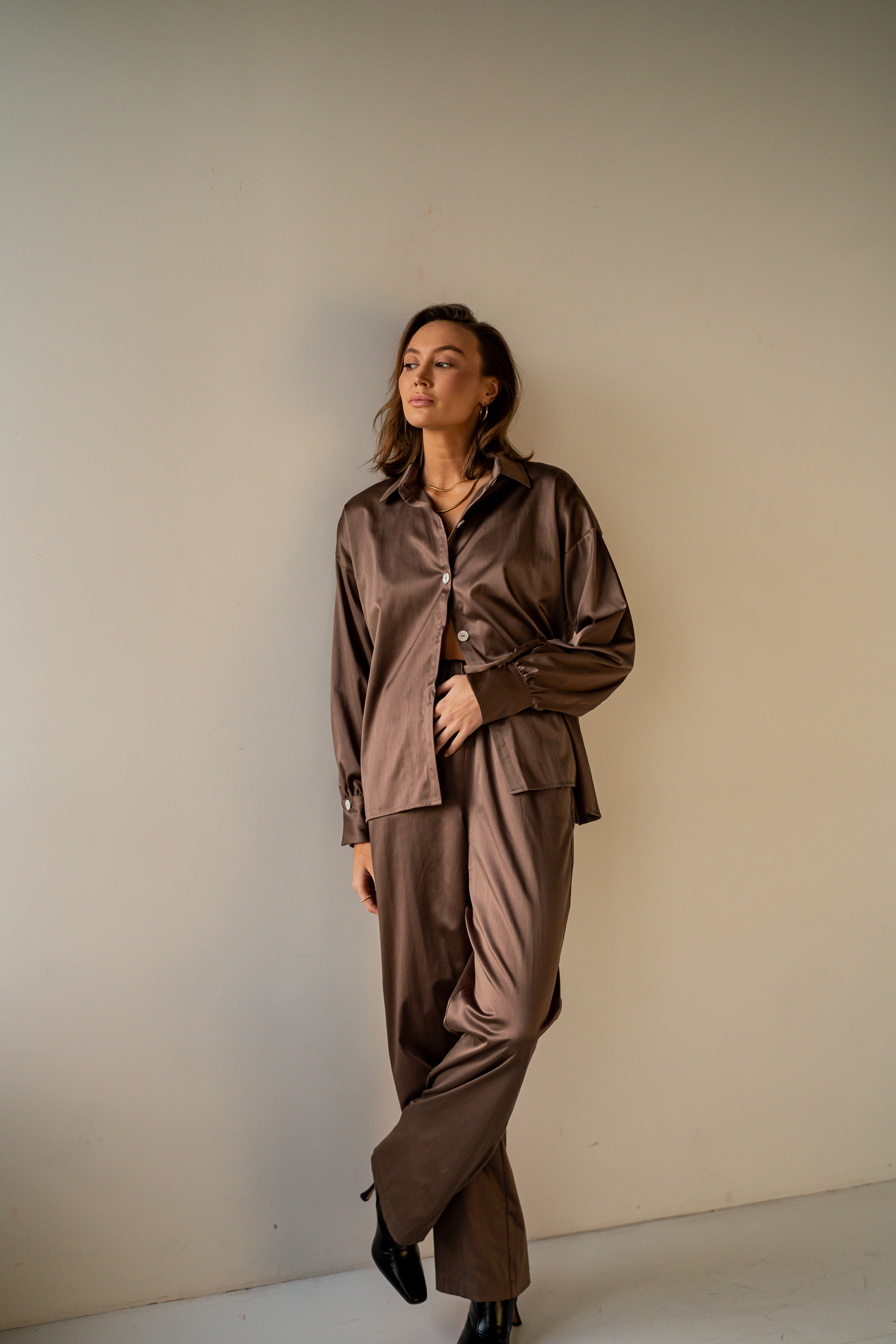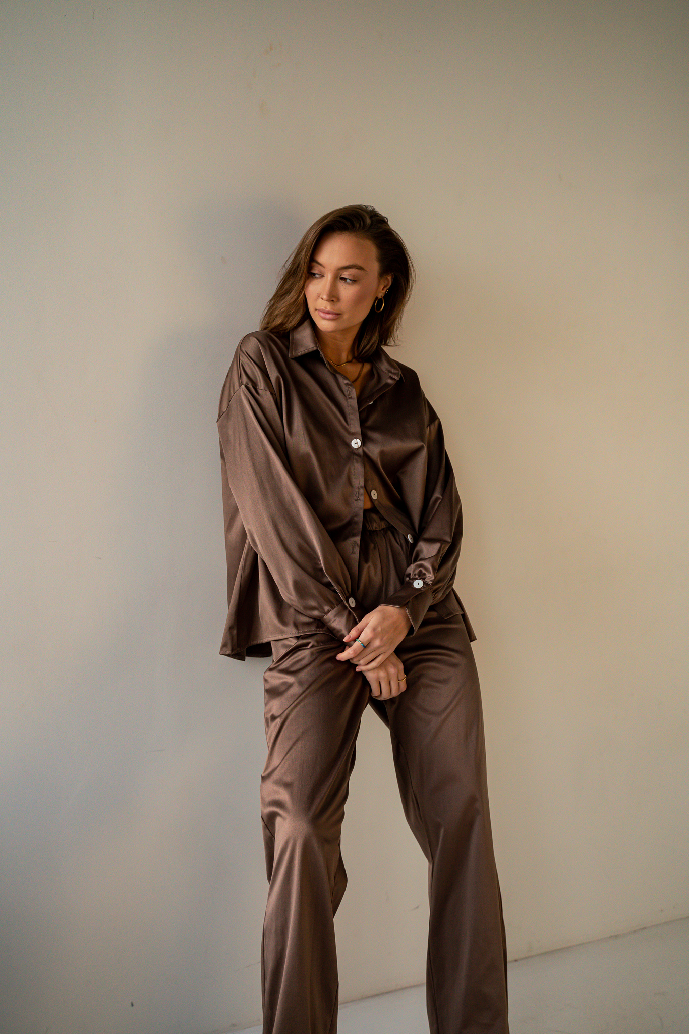 •Komplet Nugat. To komplet, który sprawdzi się idealnie na wieczorną kolację jak i na bieganie po mieście. Obniżona linia ramion, wpływa na wygodę noszenia. Gumka w talli podkreśla Twoją figurę! Zwiąż włosy w kucyk naszą frotką Rainbow i twój look gotowy.