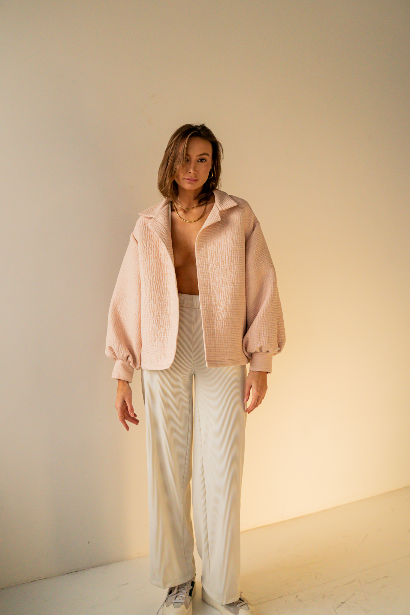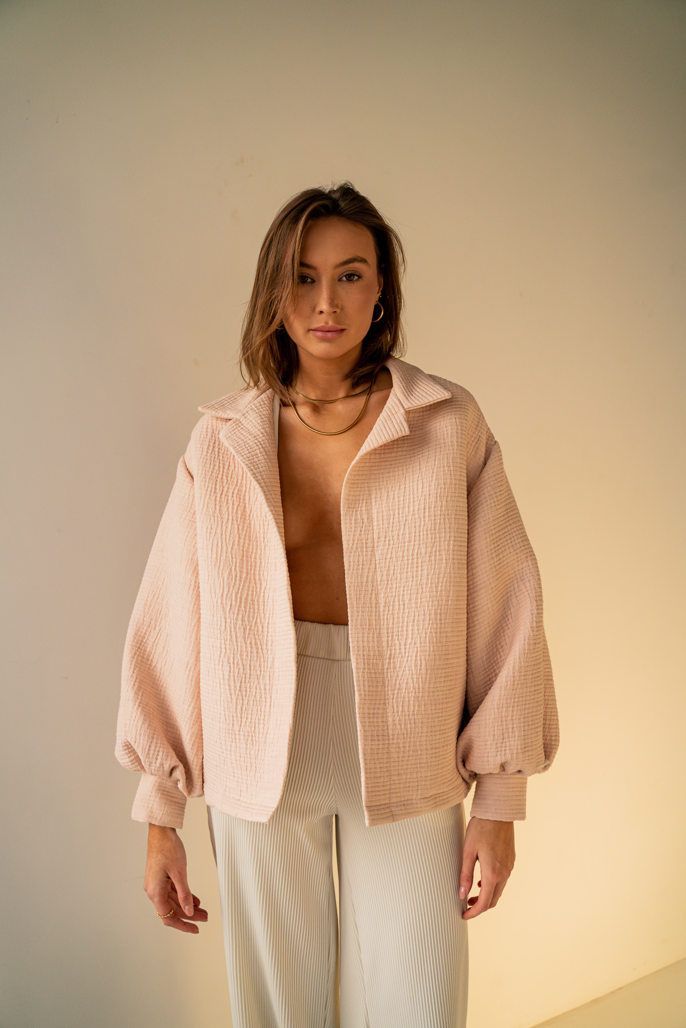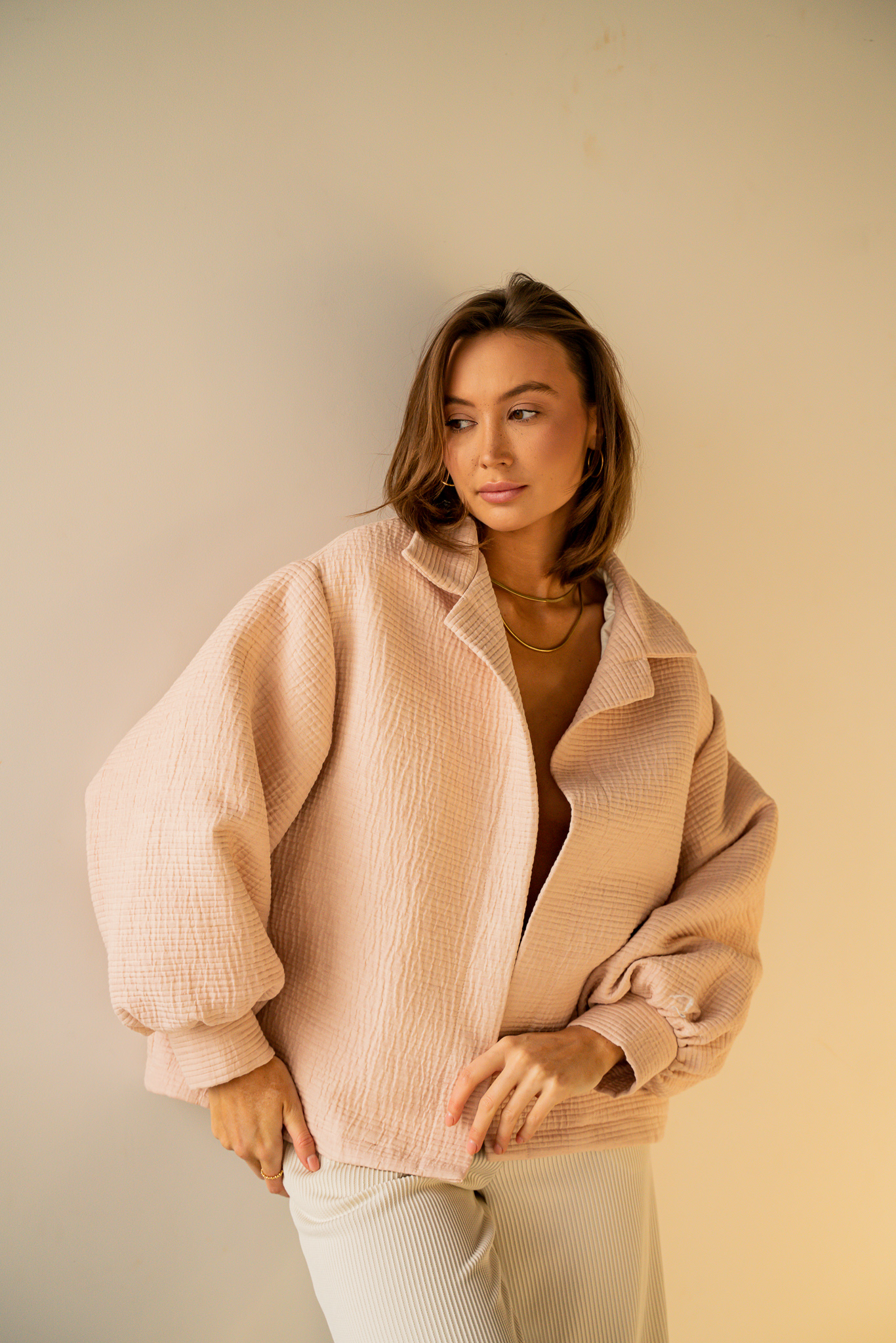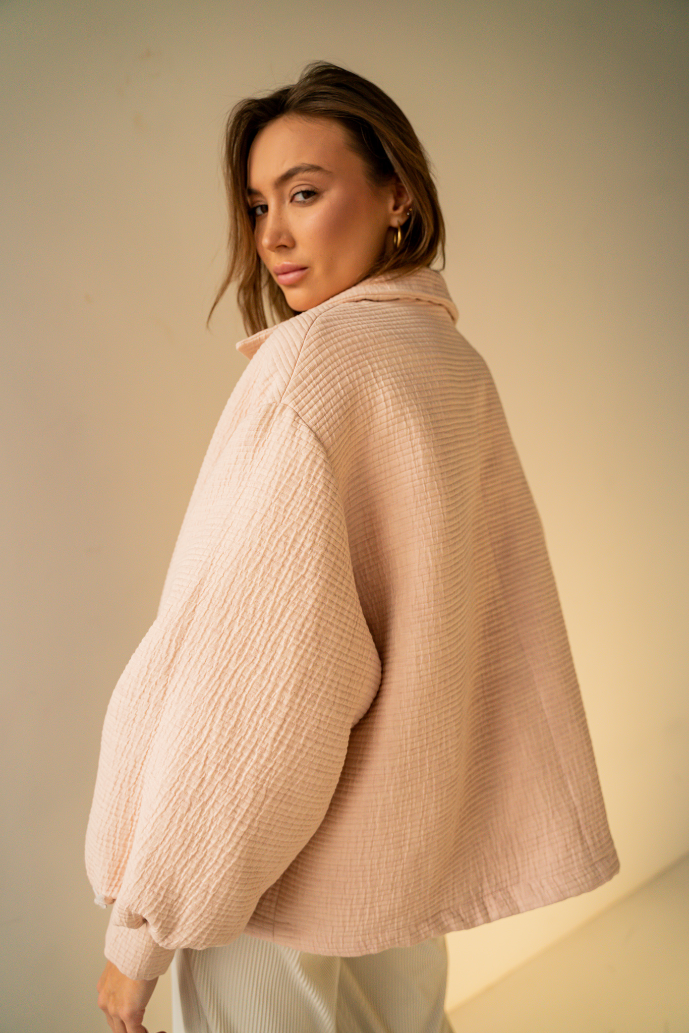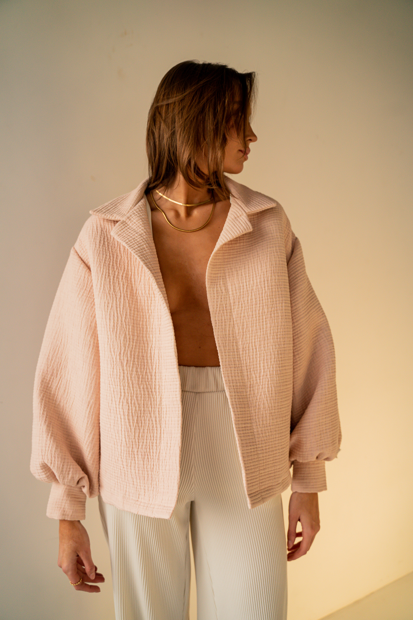 Dopracowana w każdym calu. Odszyta z wysokiej jakości mieszanki bawełny z certyfikatem GOTS. Luźny krój pozwala skompletować ją z ulubioną bluzą lub t-shirtem. Dzięki obniżonej linii ramienia ta kurtka sprawdzi się idealnie w codziennym jak i sportowym zestawieniu. Klasyczny kołnierzyk i bufiaste rękawy wyróżniają ten model na tle klasycznych kurtek. Dostępna w trzech kolorach.
