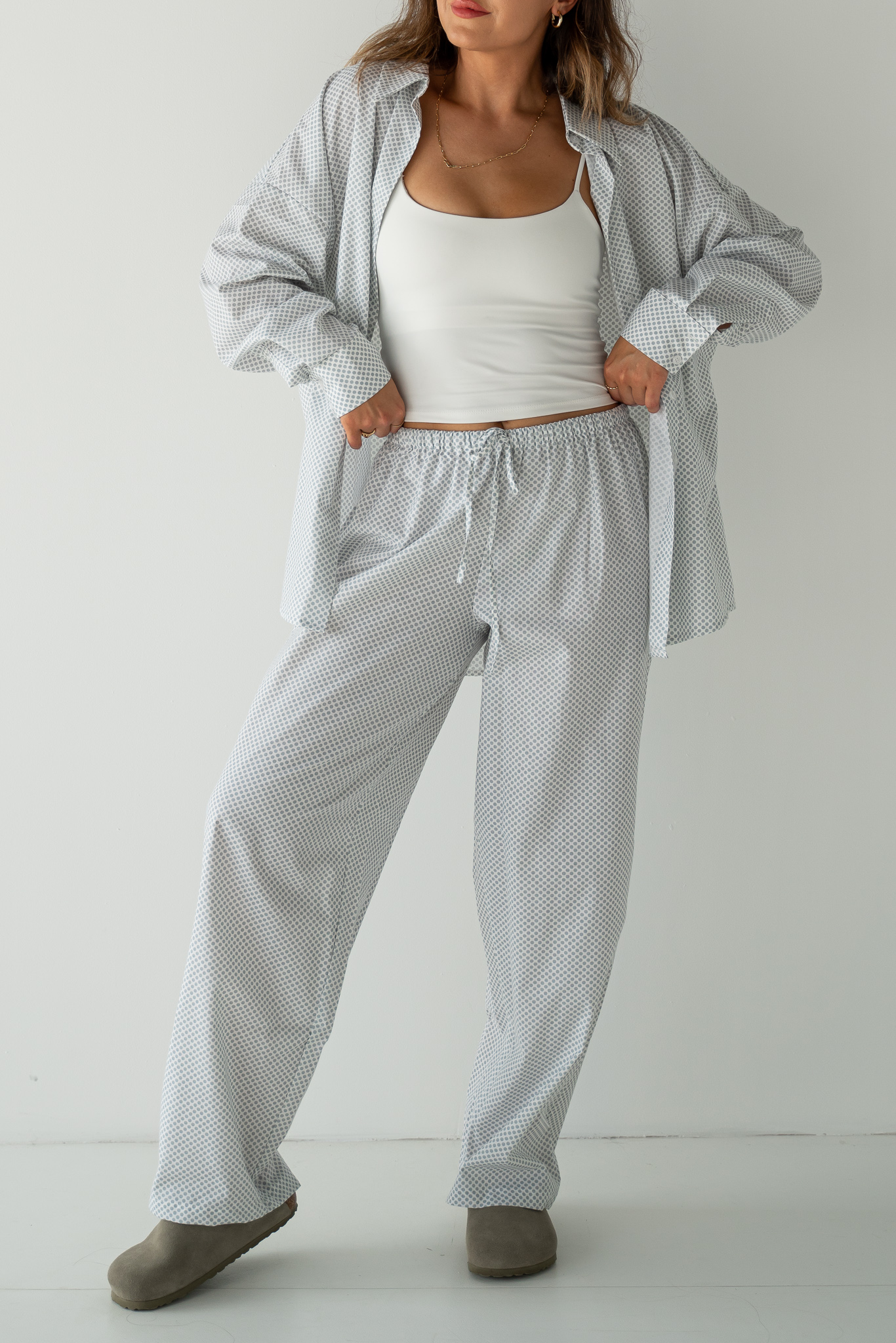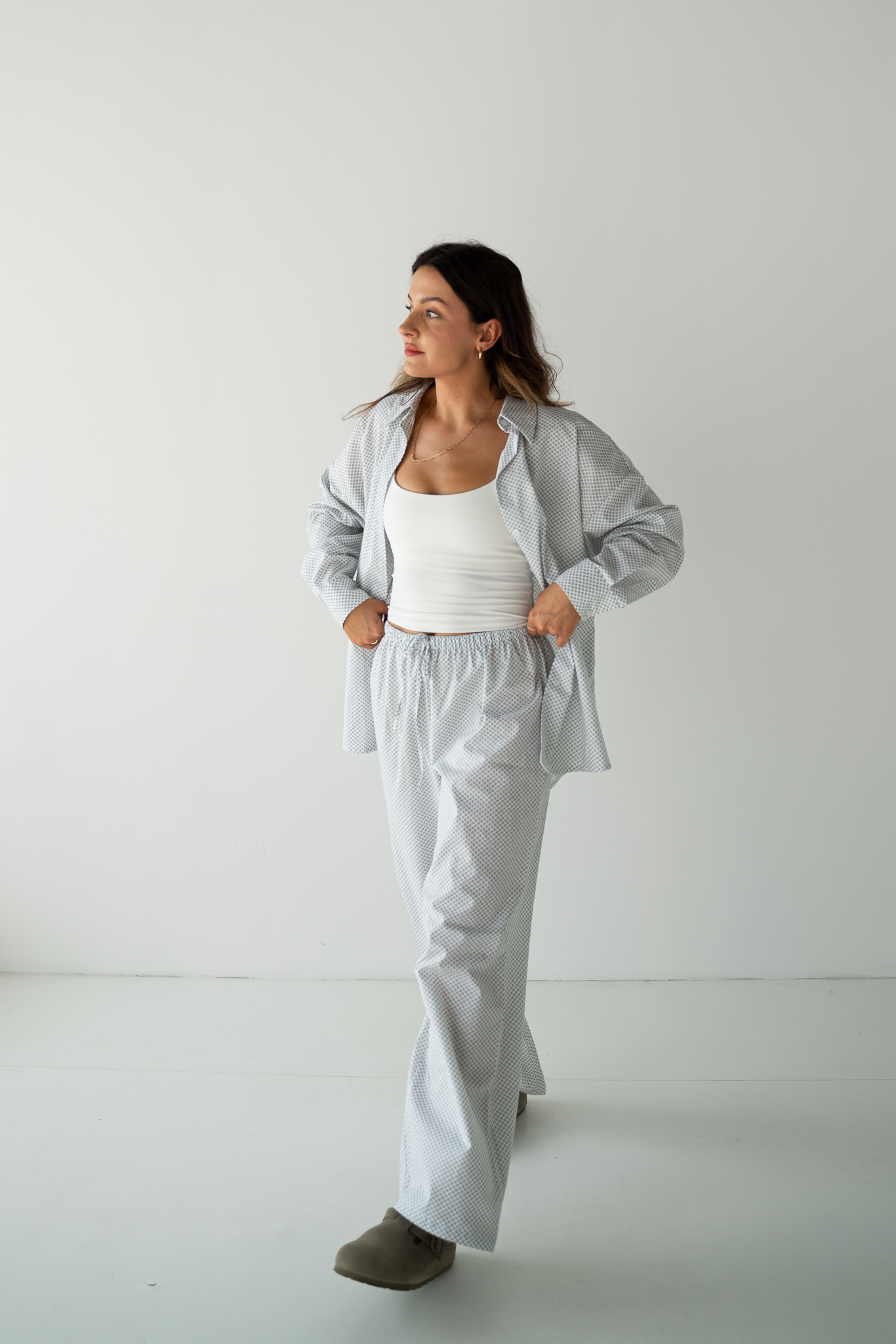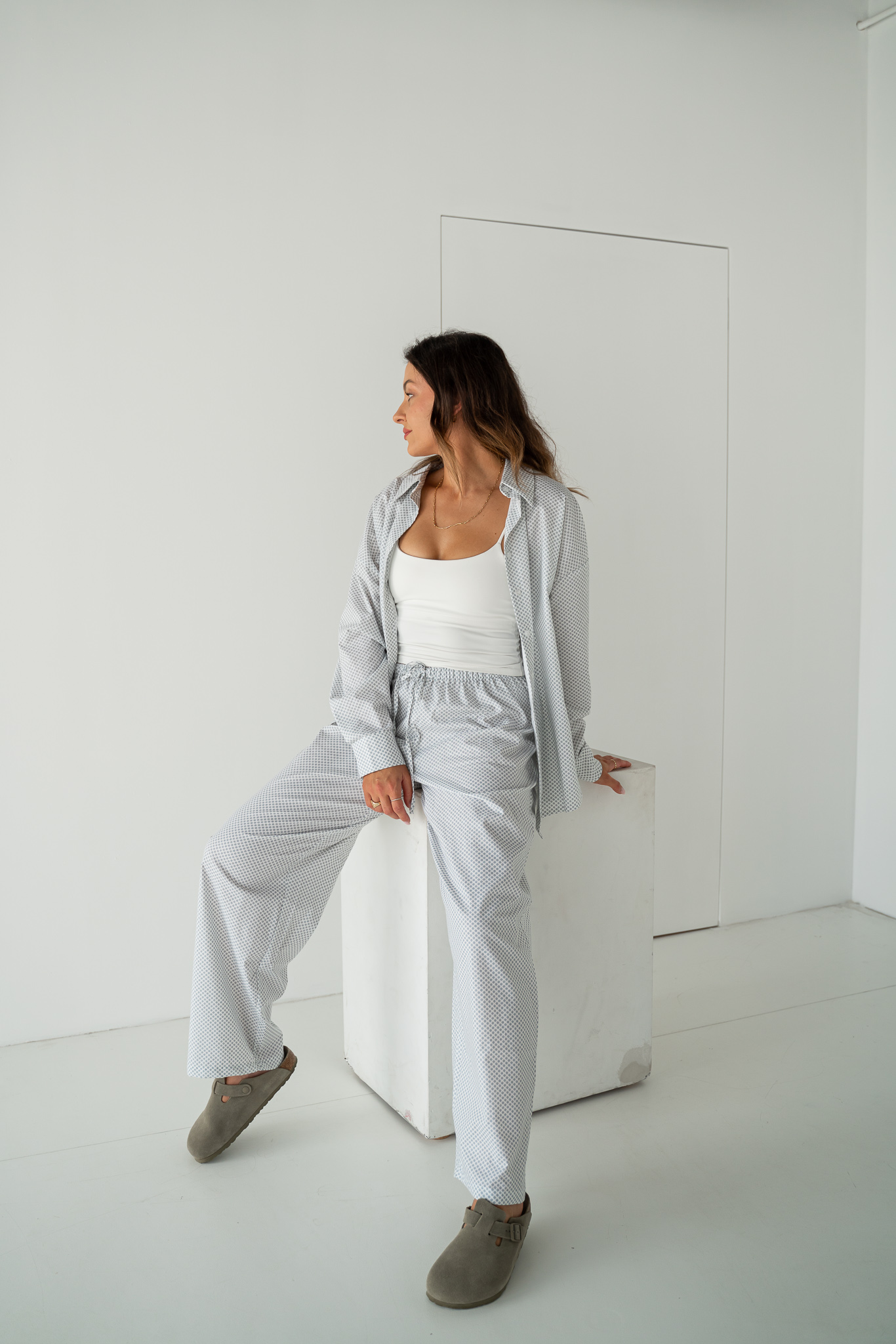 Spodnie baby blue. To idealny wybór na jesień. Swobodny fason z wiązaniem w pasie. Ubierz je na kawę z przyjaciółkami czy cozy wieczór w domu.